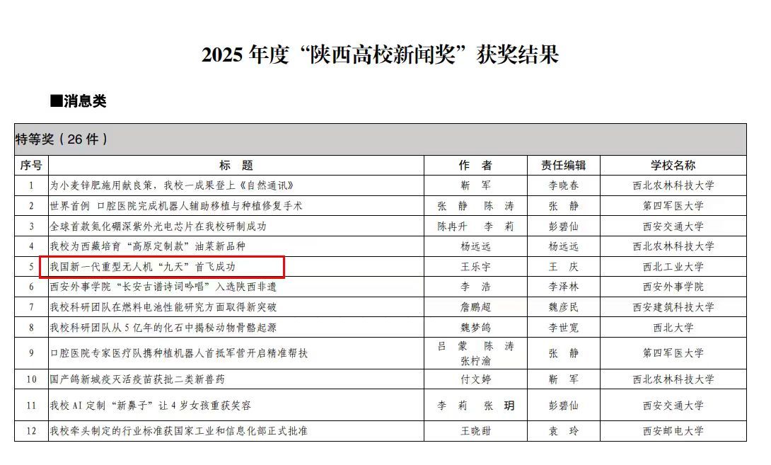 近日,2025年度陕西高校新闻奖评选结果揭晓。由研究中心供稿的新闻作品《我国新一代重型无人机“九天”首飞成功》从全省高校众多参评作品中脱颖而出,荣获特等奖(全省共26件)。